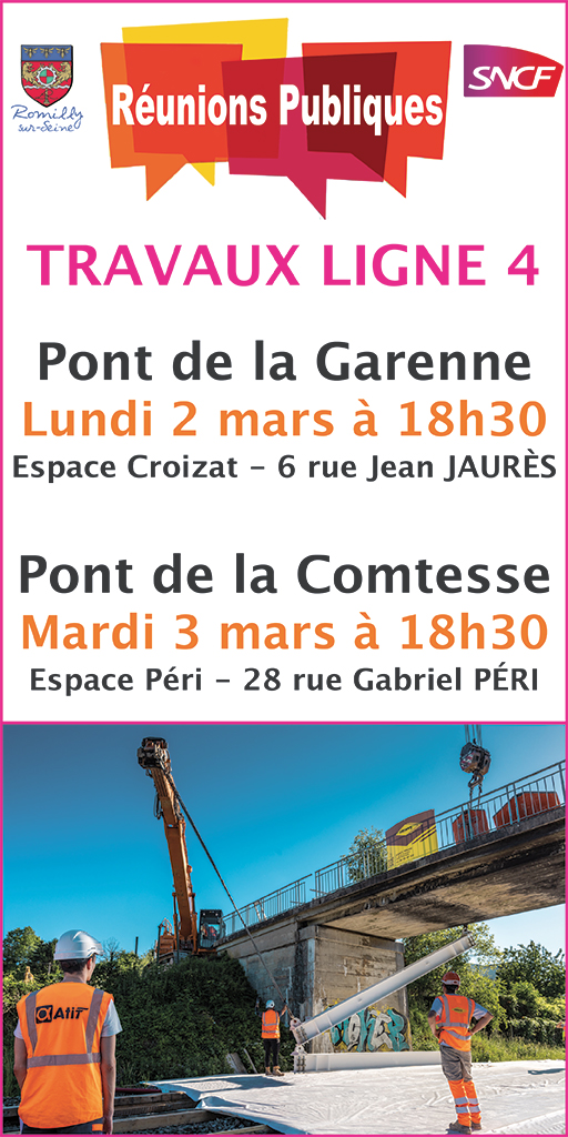 Eric VUILLEMIN, Maire de Romilly-sur-Seine et les conseillers municipaux vous donnent rendez-vous lors de deux réunions publiques qui porteront sur les travaux de la LIGNE 4 et leurs conséquences.