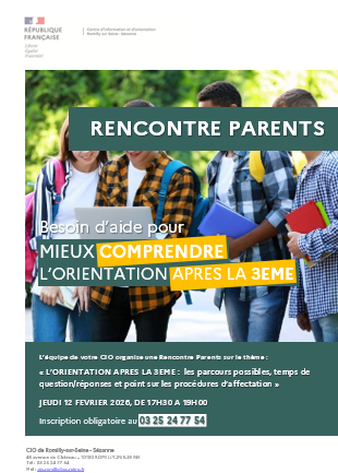 Le jeudi 12 février 2026 de 17h30 à 19h, le CIO de Romilly-sur-Seine - Sézanne organise une soirée destinée aux parents d'élèves de 3ème et qui a pour thème l'orientation après la 3ème.