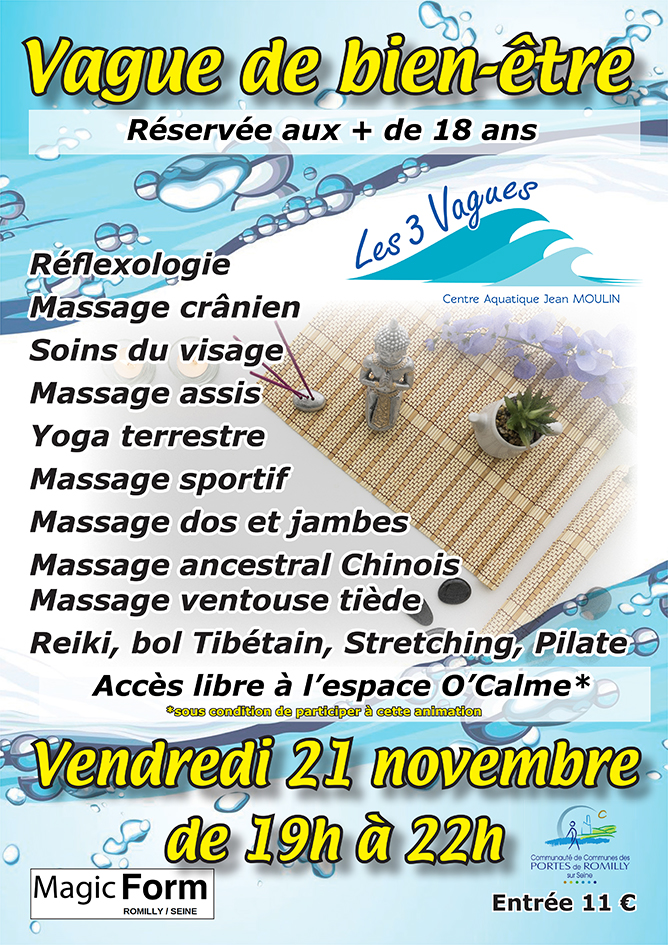 Et si vous débutiez le weekend avec une vague de bien-être ? Le centre aquatique Les 3 Vagues vous accueille pour une soirée 100% détente ! Venez vous relaxer dans les bassins, profitez d'un massage que vous aurez choisi et découvrez l'espace O'Calme avec son sauna. Venez nombreux !